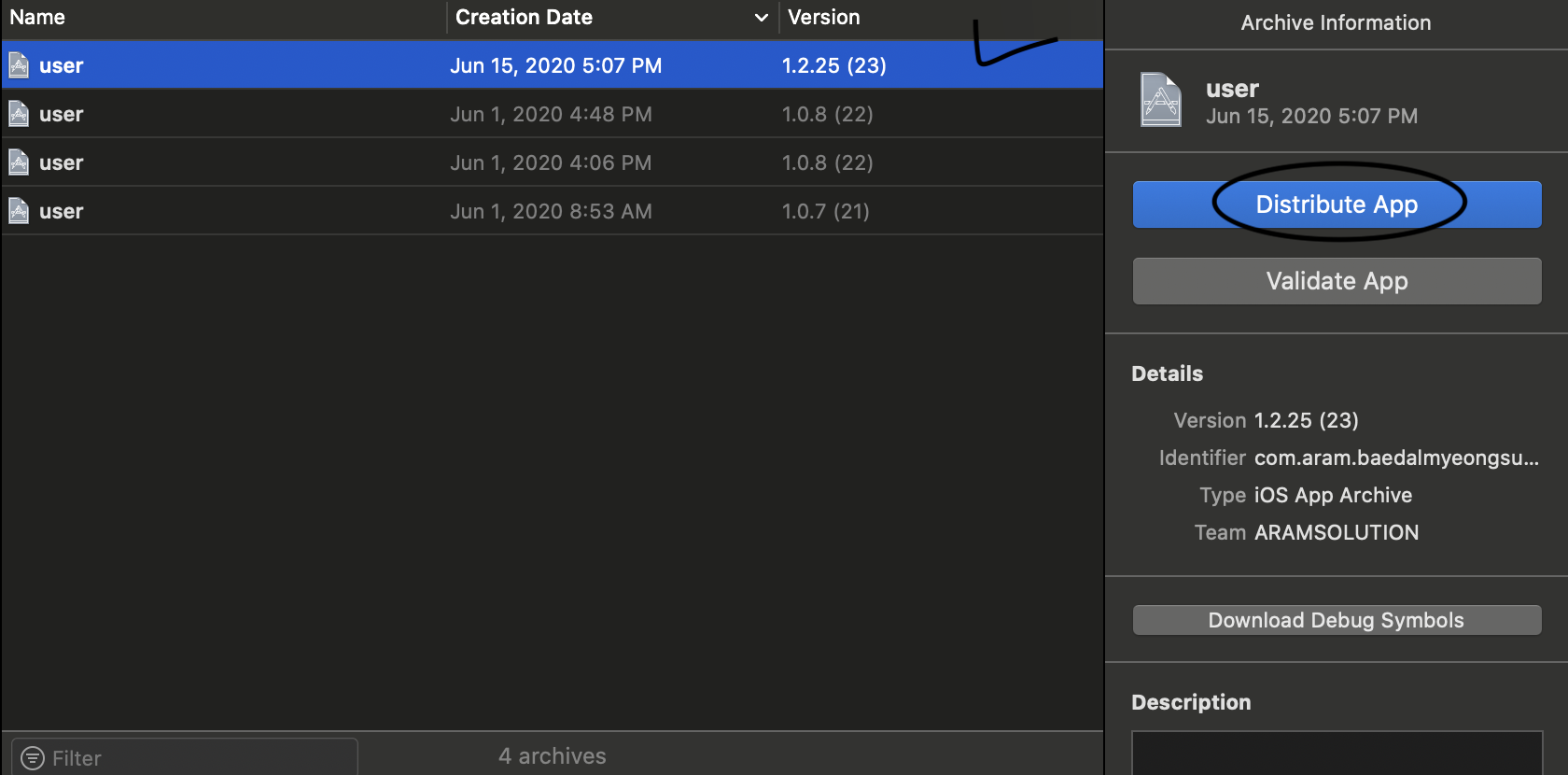 이렇게 뜨는데 자신이 설정한 버전 및 빌드번호를 잘 살펴보시고 클릭 후에 오른쪽에 Distribute App를 클릭해주세요.