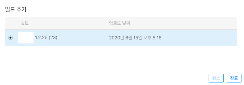 이제 여기서 빌드+ 버튼을 누르시면 Xcode에서 업로드했던 (제기준에서는 1.2.25) 의 버전이 보입니다.