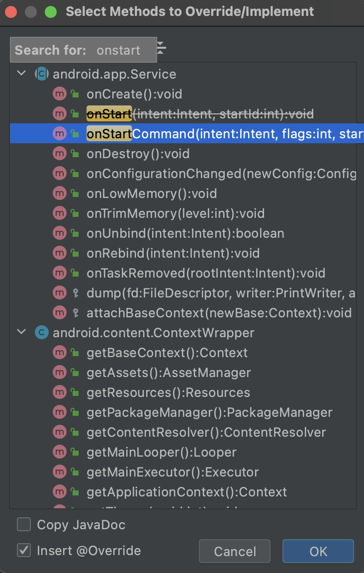 여기서 onStartCommand 라는 함수를 오버라이딩 해줄게요.