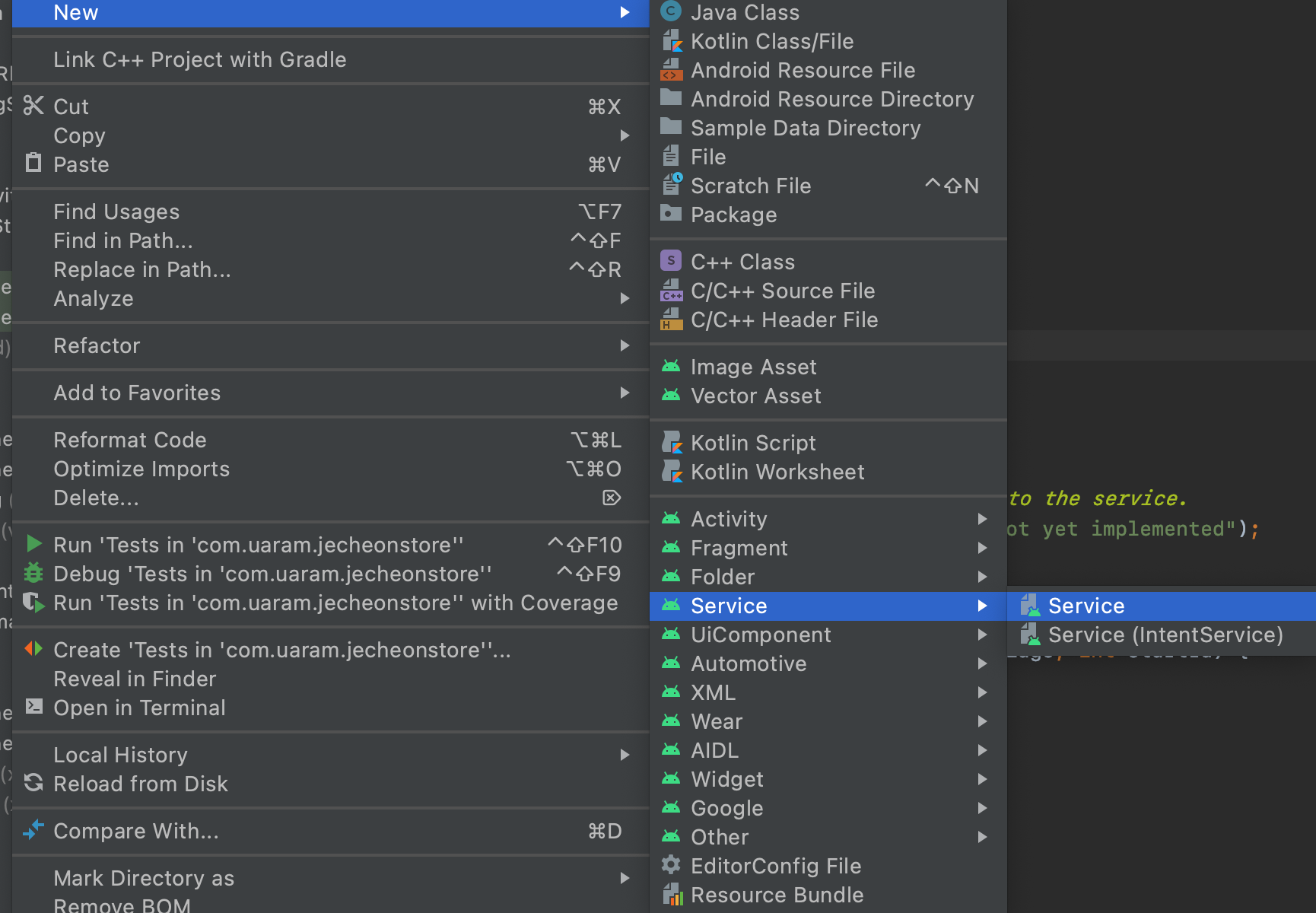 프로젝트에서 오른쪽 클릭해서 new - Service - Service 해서 서비스를 상속받는 클래스를 만들어주세요 (안드로이드 4대 컴포넌트!!)