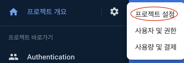 프로젝트 설정을 들어가주세요. 파이어베이스 콘솔 왼쪽 상단에 톱니바퀴 모양을 클릭하시면 됩니다.
