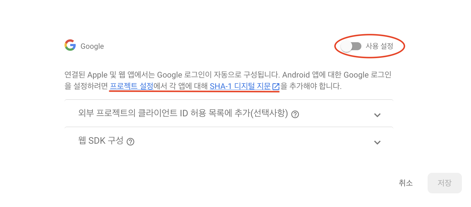 사용 설정 눌러주시고 빨간밑줄 보시면 SHA-1 등록 해야한다고 하는데