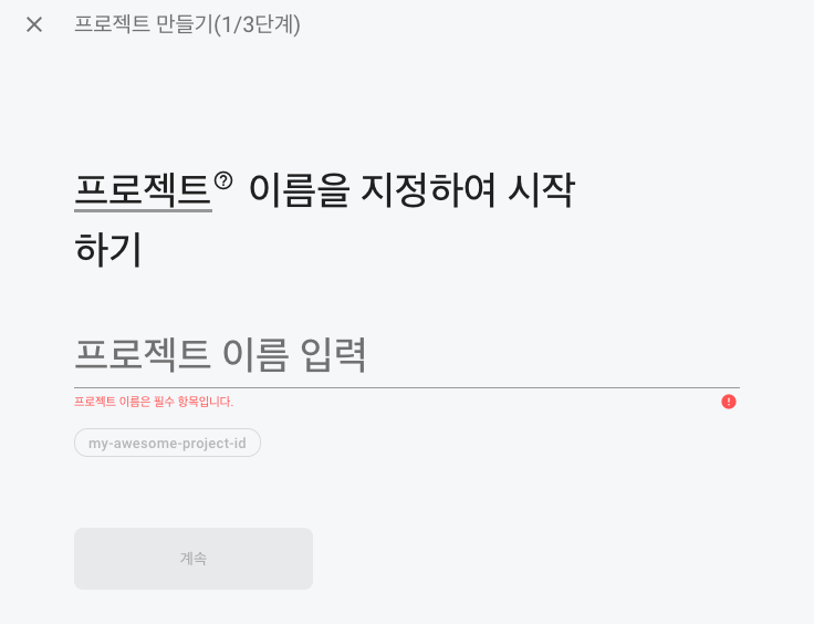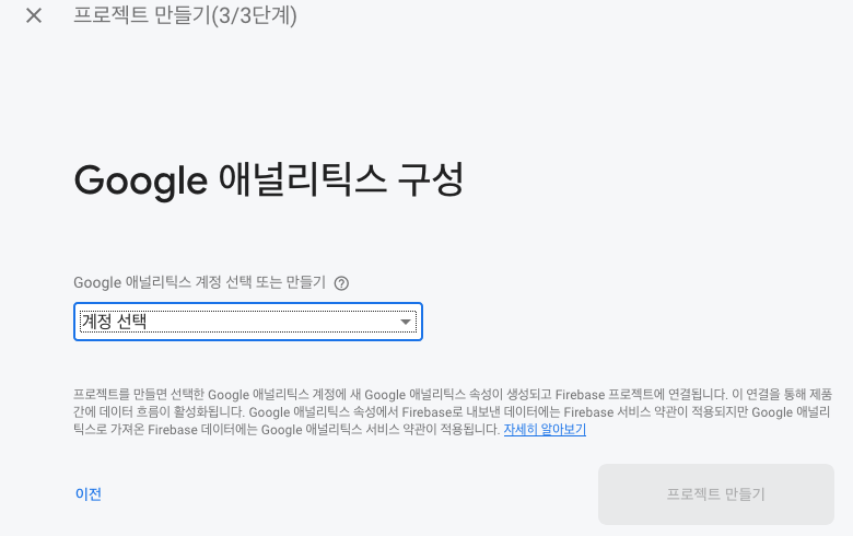 파이어베이스에 로그인 한 계정을 선택해주시면 프로젝트 만들기 버튼이 활성화됩니다.