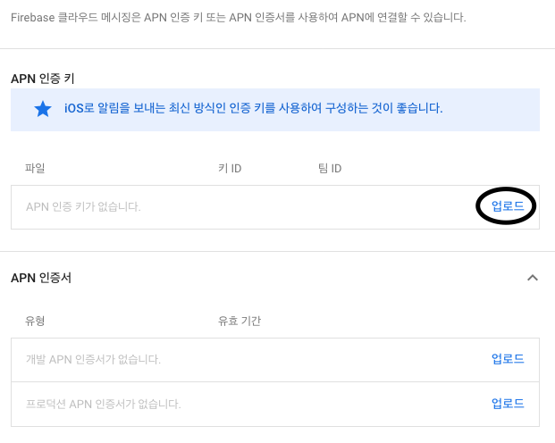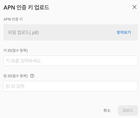 자 여기서 아까 다운받은 .p8파일을 업로드 해주셔야합니다.