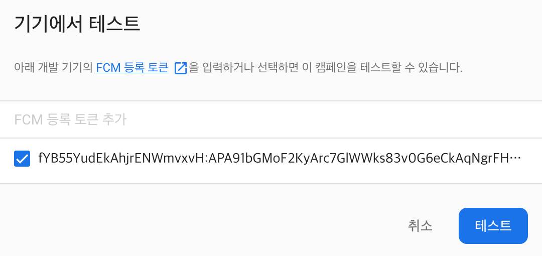 이렇게 추가된 토큰을 체크하시고 테스트 버튼을 누르시면 해당 토큰값을 가진 기기에게만 전송됩니다.