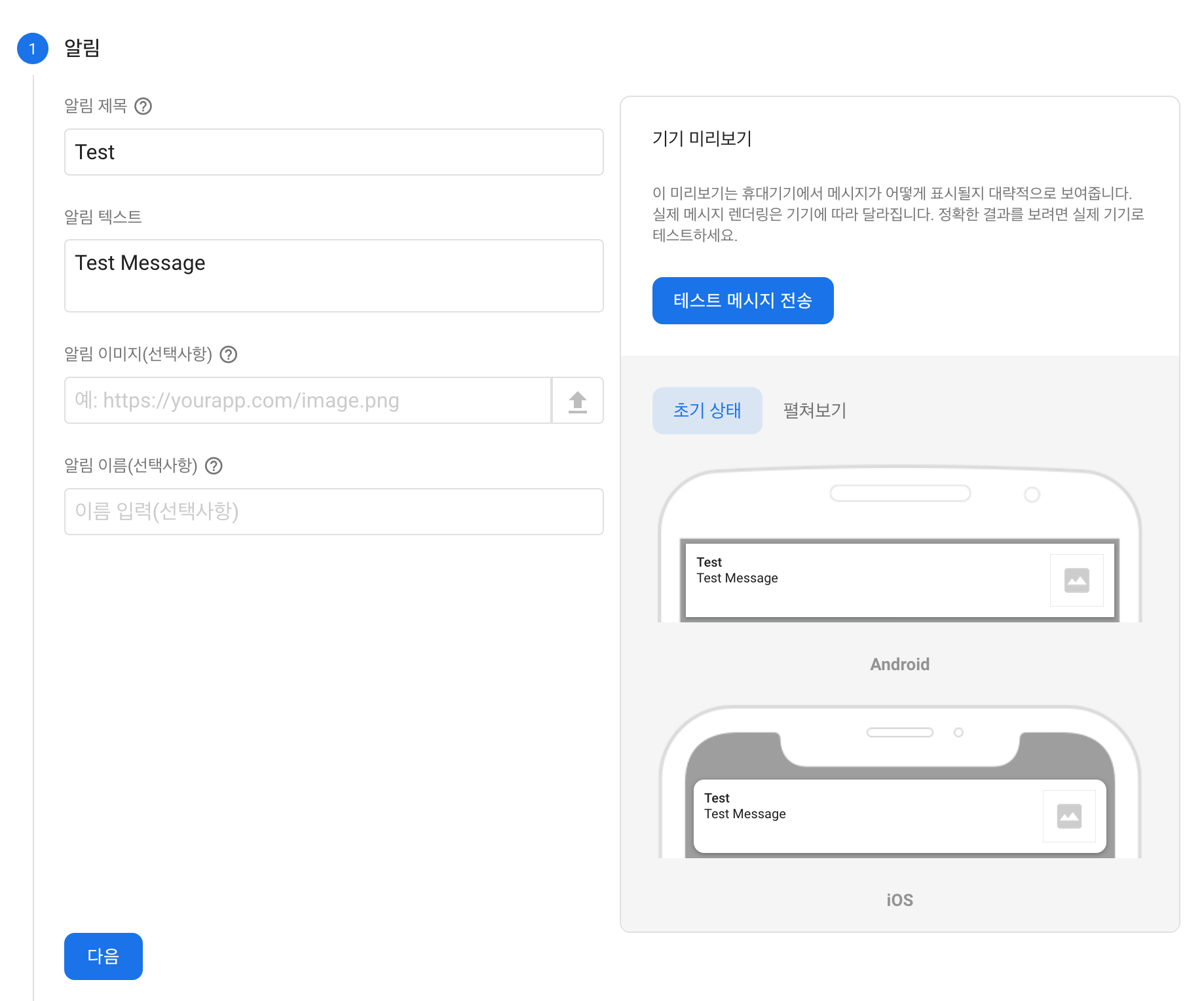 이러한 화면에서 오른쪽에 보시면 테스트 메시지 전송 이라고 있습니다. (다음 누르시면 안됩니다.)