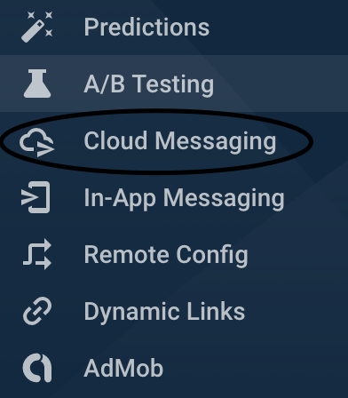 파이어베이스 콘솔에서 프로젝트 클릭 후 왼쪽에 포시면 Could Messaging가 있습니다.